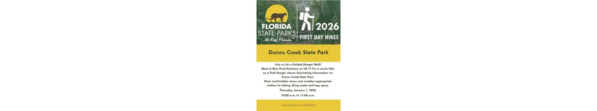 Join us for a Guided Ranger Walk! Meet at Blue Pond Entrance on US-17 for a scenic hike as a Park Ranger shares fascinating information on Dunns Creek State Park. Wear comfortable shoes and weather-appropriate clothes for hiking. Bring water and bug spray.