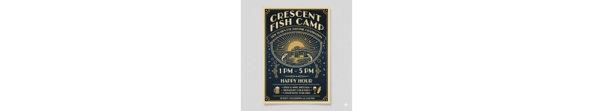 Join us at the Crescent Fish Camp for beer and wine specials, signature cocktails, champagne, and a sunset countdown at 5PM!