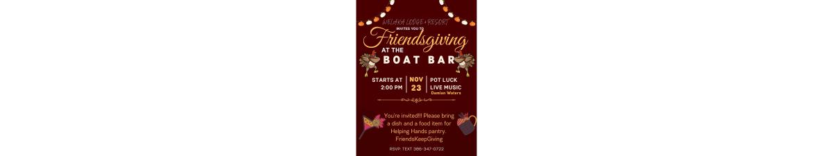 We want to thank YOU! Join us down at the Boat Bar for our fourth annual Friendsgiving celebration. Please RSVP and bring a dish. Live entertainment by Damion Waters. Don't forget a food donation for Helping Hands Pantry!