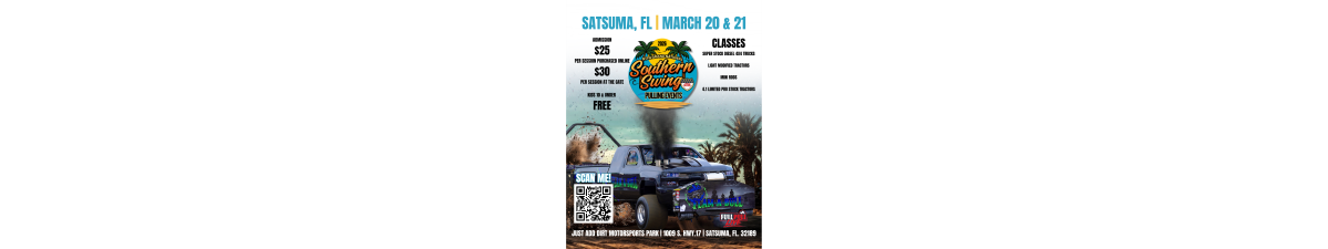 The roar continues in Satsuma as the Grand National Southern Swing rolls into the second event. Expect two action-packed nights featuring the nation's best pullers and machines built for pure power. With heart-pounding runs, family-friendly fun, and plenty of Southern hospitality. Satsuma's stop will close out the Southern swing with a bang. To purchase tickets, please follow the link above, or scan the QR code.